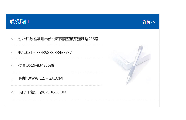 地址:常州市新北區友邦商務大廈1幢16、17層  電話:0519-85101652  傳真:0519-85112595  郵編:213022  網址:www.cz-jiayue_cn.aksmdq.com  郵箱:xiajifengaa@163.com